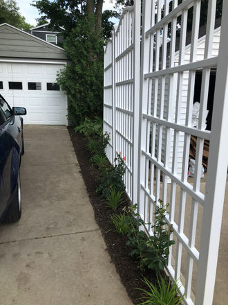 Complete property tear out, master plan design and install. Tree canopy raised. New Vinyl fence replacing dilapidated wood fence. Address drainage with grading, french drain according to city requirements. Install of natural cedar raised flower boxes. Flagstone stepping stone path. Full irrigation install. Front yard sod, backyard hand seed due to shade restraints. Maintenance and lawn care program.